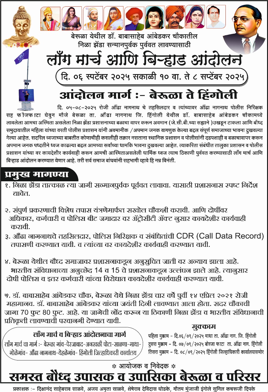कुणाचीही लेखी तक्रार नसतांना औंढा नागनाथ चे तहसीलदार यांनी औंढा पोलीस निरीक्षक यांच्या पोलीस फौजफाट्याच्या मदतीने दि.5 ऑगस्ट 2025 रोजी बेरुळा या गावचा बौध्द अस्मितेचा प्रतिक असलेला निळा (ध्वज) झेंडा जेसिबीच्या मदतीने पाडला होता.तसेच प्रशासनाला याचा जाब विचारणाऱ्या आंबेडकरी समाजाचा नागरिकांना पोलीस प्रशासनाकडून अपमानास्पद वागणूक दिल्याच्या निषेधार्थ आजपासून 6 सप्टेंबर ते 8 सप्टेंबर 2025 पर्यंत भव्य लाँग मार्च व बिऱ्हाड आंदोलनाचे आयोजन बेरुळा येथील बौद्ध उपासक उपासिका यांनी केले आहे.
