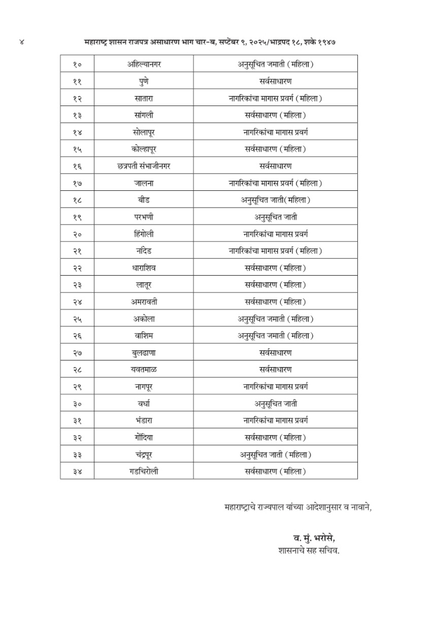 महाराष्ट्रातील 34 जिल्हा परिषद अध्यक्षपदांसाठी असलेल्या आरक्षण राज्य निवडणूक आयोगाने जाहिर केले असुन अध्यक्षपदासाठी आरक्षणाची संपूर्ण यादी खालीलप्रमाणे आहे.