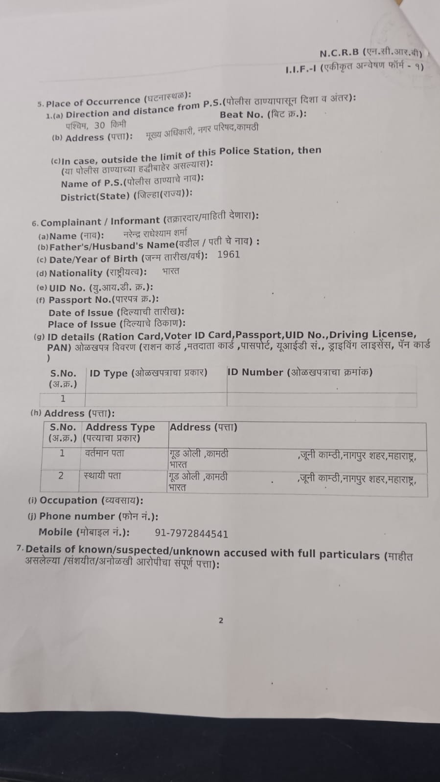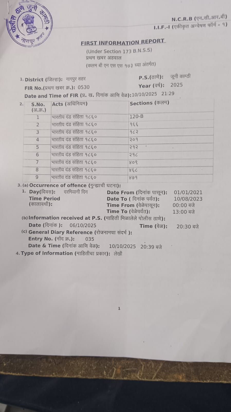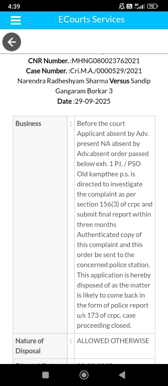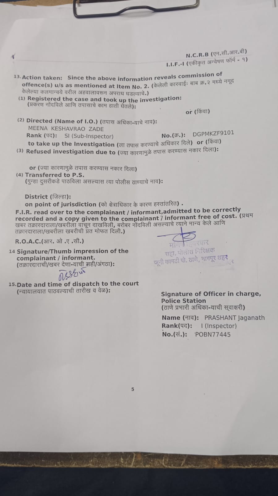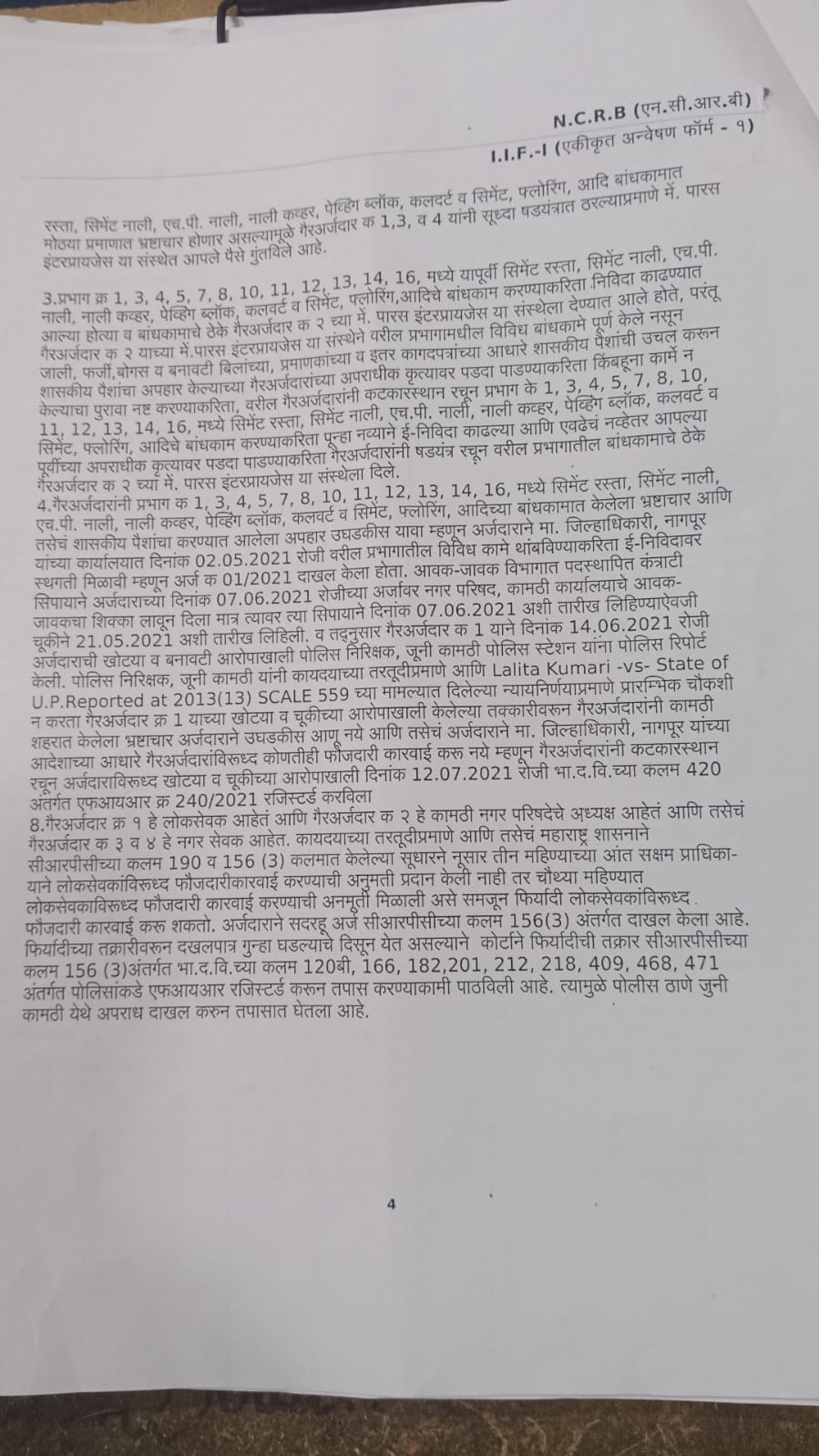 न्यायालयाने या प्रकरणाशी संबंधित सर्व कागदपत्रांची तपासणी करुन पोलिसांना गुन्हे दाखल करण्याचे आदेश दिले. न्यायालयाचा आदेश प्राप्त होताच कामठी (जुनी) पोलिस स्टेशन चे API मनिष हिवरकर यांनी त्या चौघांविरुद्ध भारतीय दंड संहिता कलम 120 (B), 166, 192, 201, 212, 218, 409, 468 व 471 अन्वये गुन्हा दाखल केला.