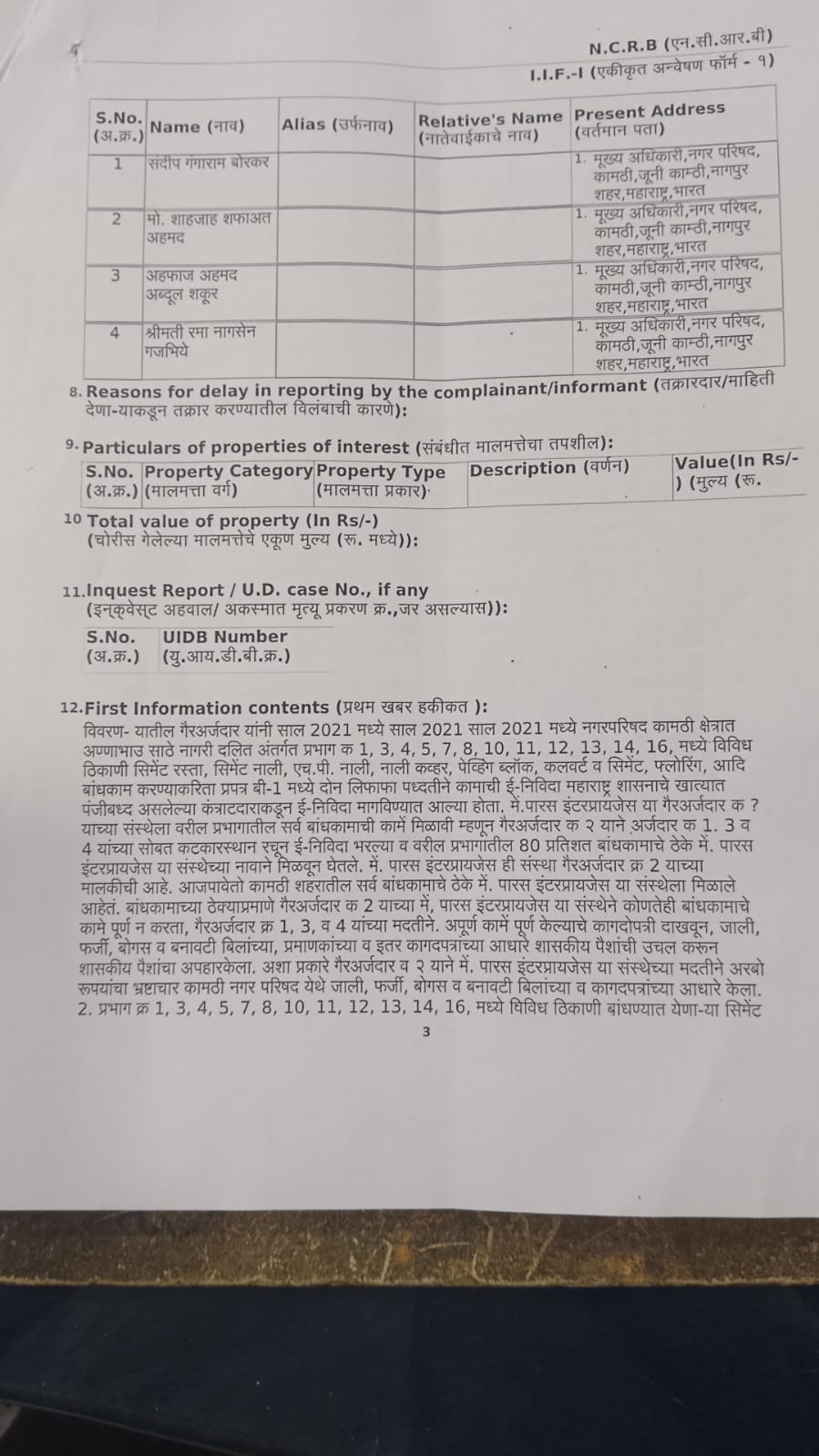 सन 2021 मध्ये विकास कामांच्या नावाखाली शासकीय निधीचा अपहार केल्याप्रकरणी कामठी (जुनी) पोलिसांनी कामठी नगरपालिकेचे तत्कालीन नगराध्यक्ष मोहम्मद शाहजहाँ शफाअत अन्सारी, उपाध्यक्ष अहफाज अहमद अब्दुल शकूर, नगरसेविका रमा नागसेन गजभिये आणि मुख्याधिकारी संदीप बोरकर यांच्या विरोधात गुन्हा दाखल केल्याची खात्रीलायक सूत्रांनी माहिती दिली. यासंदर्भात काँग्रेसचे पदाधिकारी नरेंद्र राधेश्याम शर्मा, रा. गुड ओली कामठी यांनी जुनी कामठी पोलीस स्टेशन येथे तक्रार केली होती.पोलिसांनी कुठलीही कारवाई न केल्याने त्यांनी शेवटी न्यायालयात दाद मागितली. सन 2021 मध्ये कामठी नगरपालिकेच्या नगराध्यक्षपदी काँग्रेसचे मोहम्मद शाहजहाँ शफाअत अन्सारी व उपाध्यक्षपदी अहफाज अहमद अब्दुल शकूर, तर मुख्याधिकारीपदी संदीप बोरकर व रमा गजभिये या बसपच्या बांधकाम सभापती होत्या. त्यांच्या कार्यकाळात अण्णाभाऊ साठे दलित नागरी फंडातुन सन 2021 मध्ये कामठी शहरातील प्रभाग क्रमांक 1, 3, 4, 5 7, 8, 10, 11, 12, 13, 14 आणि 16 मध्ये अंतर्गत रस्त्यांचे सिमेंट कॉंक्रीटीकरण, सिमेंट नाल्यांची दुरुस्ती व बांधकाम, एच.पी. नाली, नाल्यांचे कव्हर, पेव्हिंग ब्लॉक, कल्व्हर्ट व फ्लोरिंग आदी विकास कामांना सुरुवात केली. या सर्व कामांचे कंत्राट पारस इंटरप्रायजेस नामक कंत्राटदार कंपनीला देण्यात आले होते.या कंपनीने ही सर्व कामे पूर्ण न करताच या पदाधिकारी व अधिकाऱ्यांनी ती पूर्ण झाल्याचे कागदोपत्री दाखविले. कामे अर्धवट असताना कंत्राटदाराला पूर्ण कामांची बिले देण्यात आली. ती कंत्राटदार कंपनी ही नगराध्यक्ष मोहम्मद शाहजहाँ शफाअत अन्सारी यांच्या मालकीची आहे. त्यांच्यासह उपाध्यक्ष अहफाज अहमद अब्दुल शकूर, नगरसेविका रमा गजभिये आणि मुख्याधिकारी संदीप बोरकर यांनी संगनमत करून ही बिले कंत्राटदार कंपनीला दिली. या मंडळींनी प्रत्येक ठिकाणी हस्तक्षेप करत व त्यांच्या राजकीय प्रभावाचा वापर करून निधीची अफरातफर करीत मोठ्या प्रमाणात भ्रष्टाचार केला असल्याची तक्रार न्यायालयात दाखल केली होती . काही राजकीय नेते या मंडळींना राजकीय संरक्षण देत असल्याने कामठी नगर परिषदेतील प्रत्येक विकास कामातील भ्रष्टाचाराची निष्पक्ष चौकशी करण्याची नरेंद्र शर्मा यांनी मागणी केली होती.