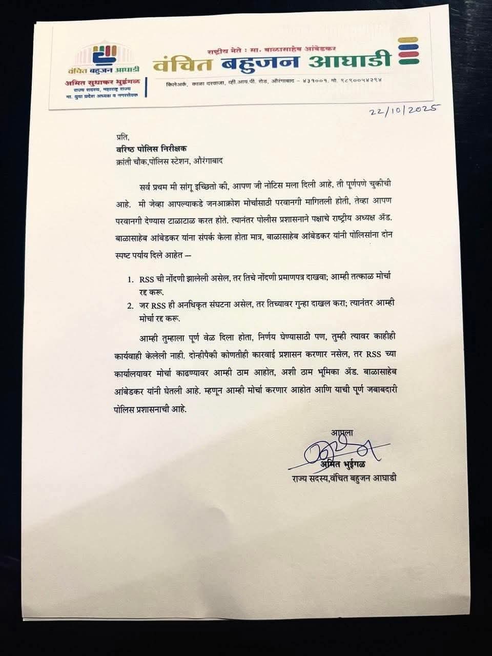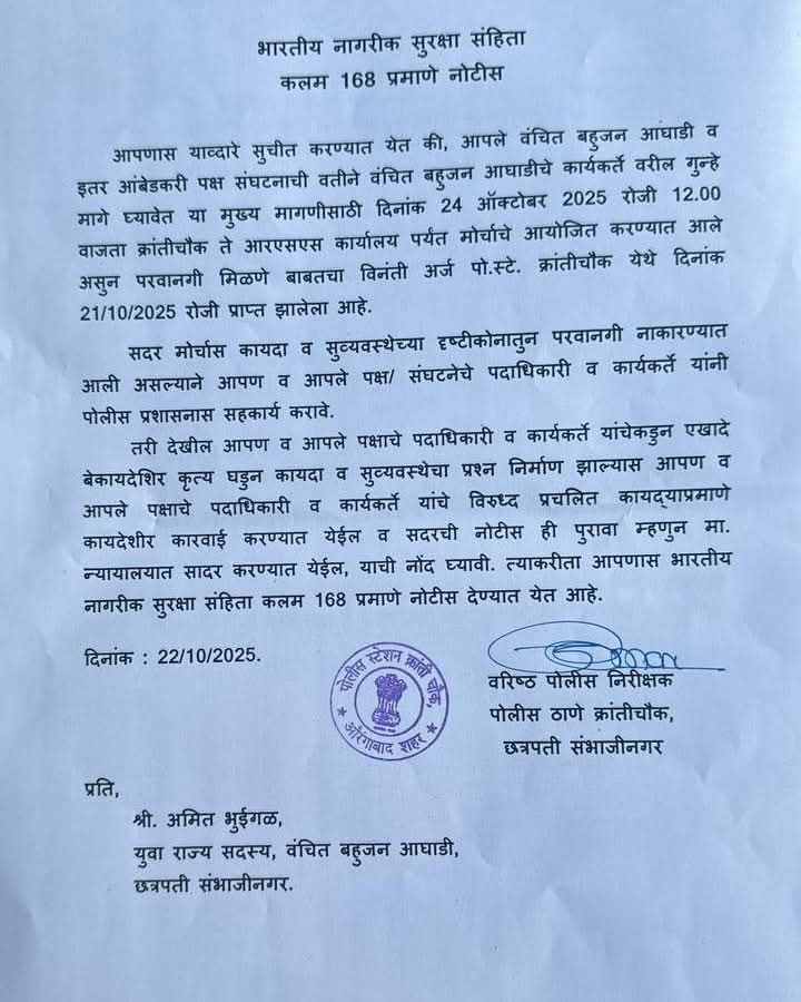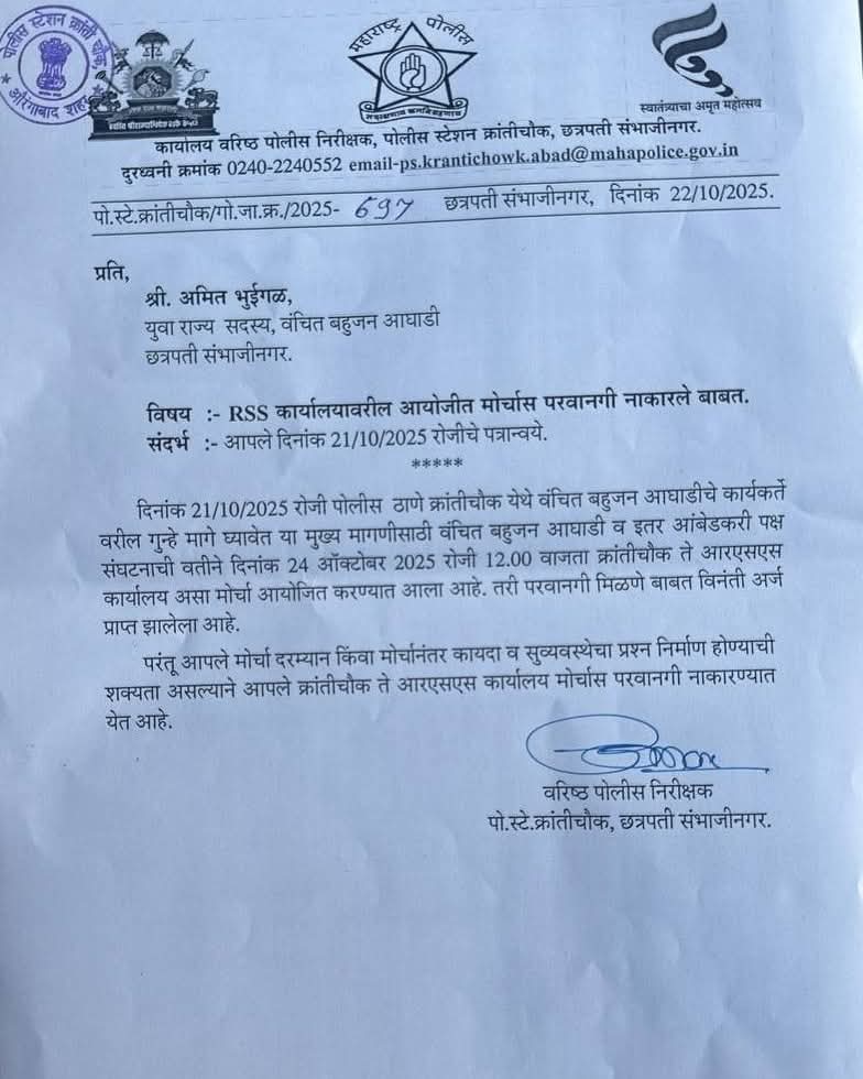 वंचित बहुजन आघाडीच्या जन आक्रोश मोर्च्याला औरंगाबाद पोलिसांनी परवानगी नाकारली आहे. वंचित बहुजन आघाडीच्या वतीने 24 ऑक्टोबर 2025 रोजी क्रांतीचौक ते RSS कार्यालय असा मोर्चा आयोजित करण्याची केलेली विनंती क्रांतीचौक पोलीस ठाण्याने फेटाळली आहे. कायदा व सुव्यवस्थेचा प्रश्न निर्माण होण्याची शक्यता लक्षात घेऊन हा निर्णय घेण्यात आला आहे.
