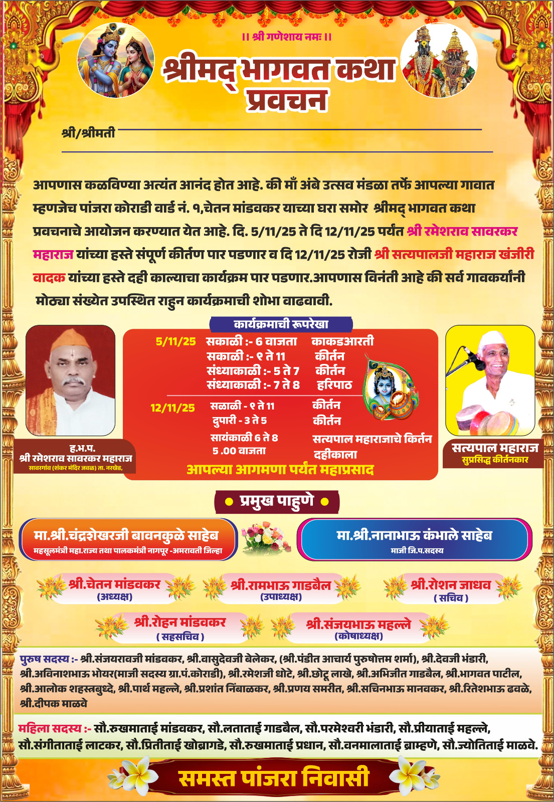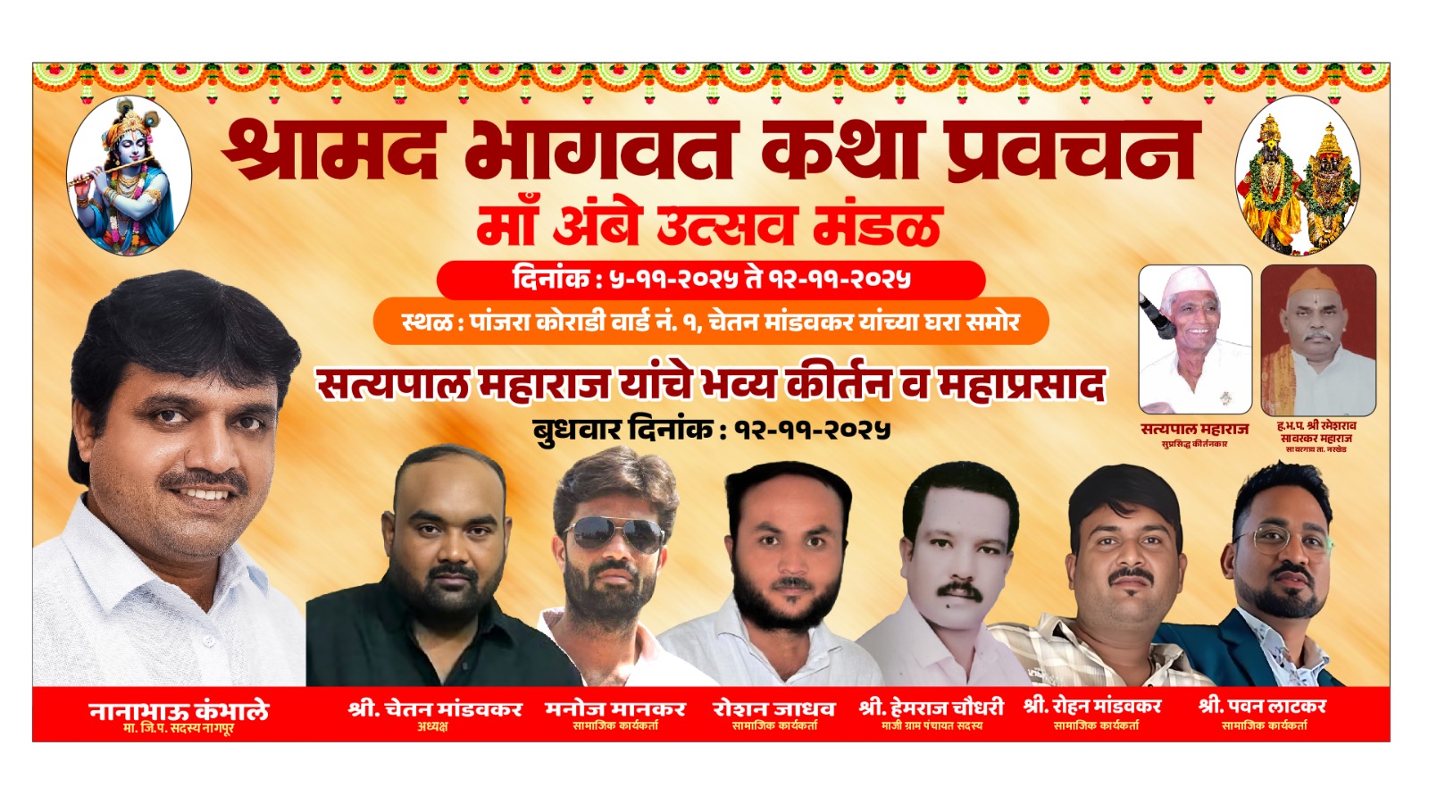 नागपूर जिल्ह्य़ातील कोराडी पांजरा येथील वार्ड क्र. 1 मध्ये माँ अंबे उत्सव मंडळातर्फे दि 5 नोव्हेंबर 2025 ते 12 नोव्हेंबर 2025 पर्यत श्रीमद भागवत कथा प्रवचनाचे आयोजन करण्यात आले आहे.