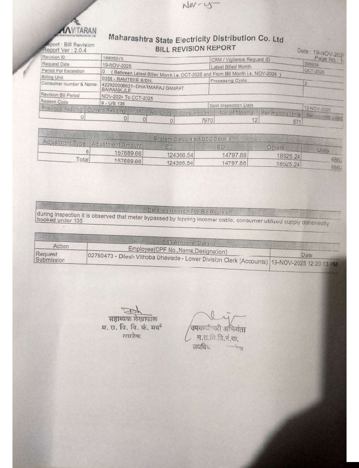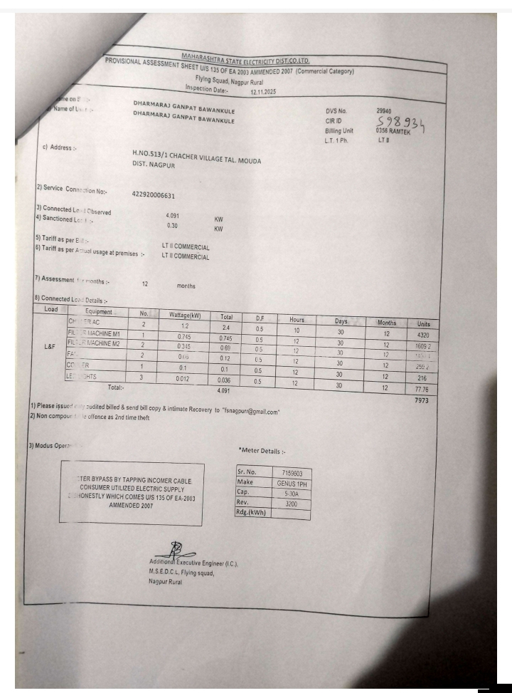 नागपूर जिल्ह्य़ातील मौजा चाचेर येथे अजब प्रकार घडत आहे.शासकीय मालमत्ता, विदयुत चोरी,महसूल विभागाची रेती चोरी करण्याचे प्रमाण मोठ्या प्रमाणात वाढलेले आहे. 12/11/2025 ला विद्युत भरारी पथक यांनी चाचेर गावांमध्ये विद्युत चोरी पकडून धाडी टाकण्यात आले. सुत्राकडुन मिळालेल्या माहितीनुसार, राज्यमंत्री आशिष जयस्वाल राज्यमंत्री यांचे अत्यंत विश्वासू पात्र असल्याचे धर्मराज बावनकुळे है सांगतात. ते परमपूज्य परमात्मा एक सेवक मंडळ टिमकी शाखा चाचेर चे अध्यक्ष, मार्गदर्शक, सामाजिक कार्यकर्ते असुन यांच्याकडे महावितरण कंपनीच्या भरारी पथकाने तिसऱ्यांदा विदयुत चोरी पकडली. मे 2023 त्यांच्या कडे पहिल्यांदा चोरी पकडण्यात आली. त्यामध्ये एक लक्ष 33 हजार रुपये दंड आकारण्यात आला.परंतु कारवाई झाल्याच्या नंतरही त्यांची विद्युत चोरी ही थांबलेली नाही. ते वारंवार विद्युत चोरी करत असल्याचा त्यांचेवर आरोप आहे.दि. 12/11/2025 या तारखेला त्यांची विद्युत चोरी पकडण्यात आली. सब डिविजन रामटेक यांनी धर्मराज बावनकुळे यांना 1 लाख 57,689 दंड आकारला अशी माहिती रामटेक उपविभागीय कार्यालयाचे उपकार्यकारी अभियंता यांनी दिली आहे. बावनकुळेंच्यज वीजचोरीमुळे शासनाच मोठ्या प्रमाणामध्ये नुकसान होत आहे .