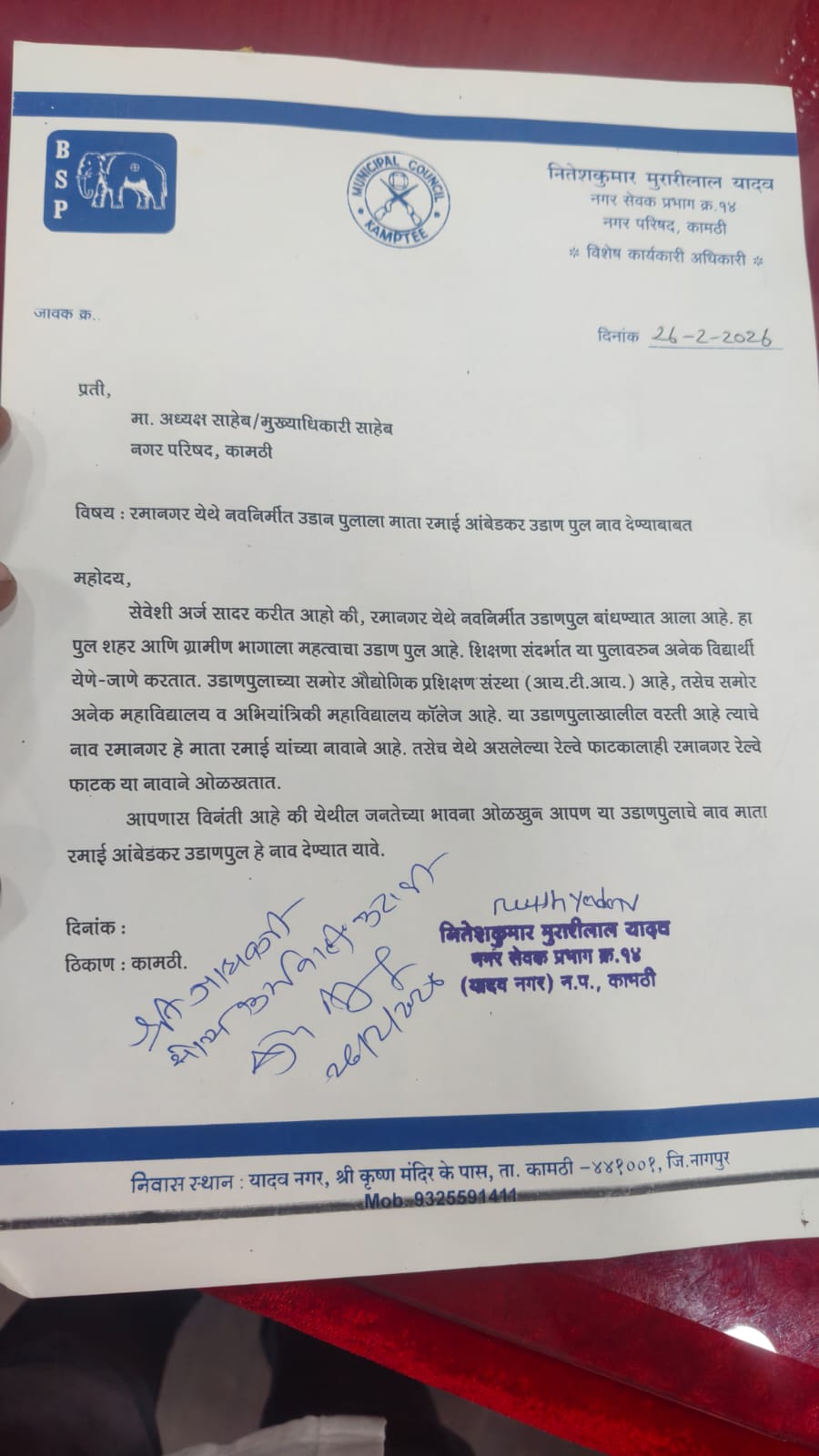 कामठी | 26 फरवरी 2026 कामठी शहर के विकास में मील का पत्थर साबित होने वाले रमानगर रेलवे फाटक स्थित नवनिर्मित उड़ान पुल (Flyover) के नामकरण को लेकर स्थानीय स्तर पर मांग तेज हो गई है। कल 26 फरवरी 2026 को प्रभाग क्रमांक 14 के नगरसेवक नितेश कुमार मुरारीलाल यादव के नेतृत्व में एक प्रतिनिधिमंडल ने नगर परिषद अध्यक्ष और मुख्याधिकारी को इस संबंध में एक औपचारिक निवेदन सौंपा।